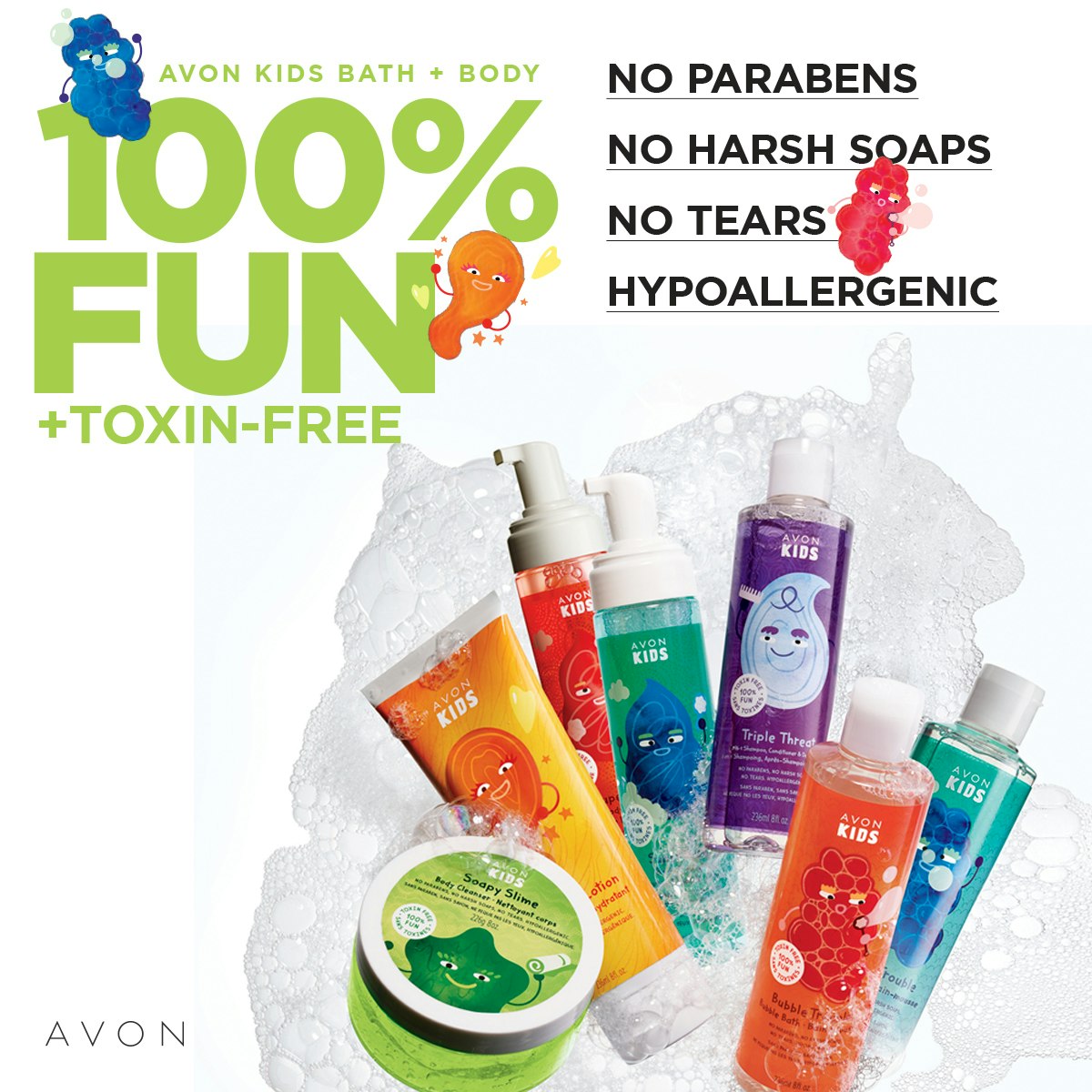 Avon Kids Bath & Body features kid-approved colors, scents and textures that are toxin-free so they’re gentle enough for your child’s delicate skin. No parabens, harsh soaps or tears. Just 100% good, clean fun!